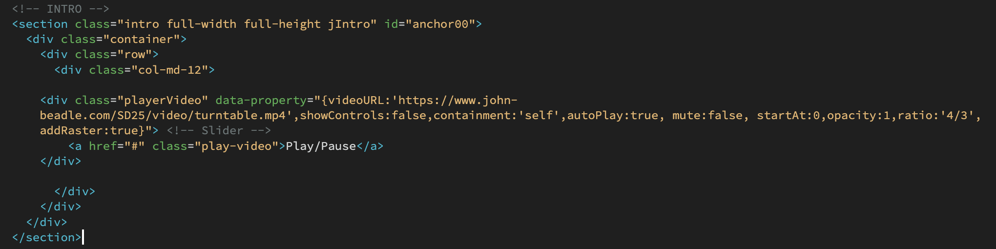 <div class="playerVideo" data-property="{videoURL:'HFpou6izBQg',showControls:false,containment:'self',autoPlay:true, mute:false, startAt:0,opacity:1,ratio:'4/3', addRaster:true}"> <!-- Slider -->