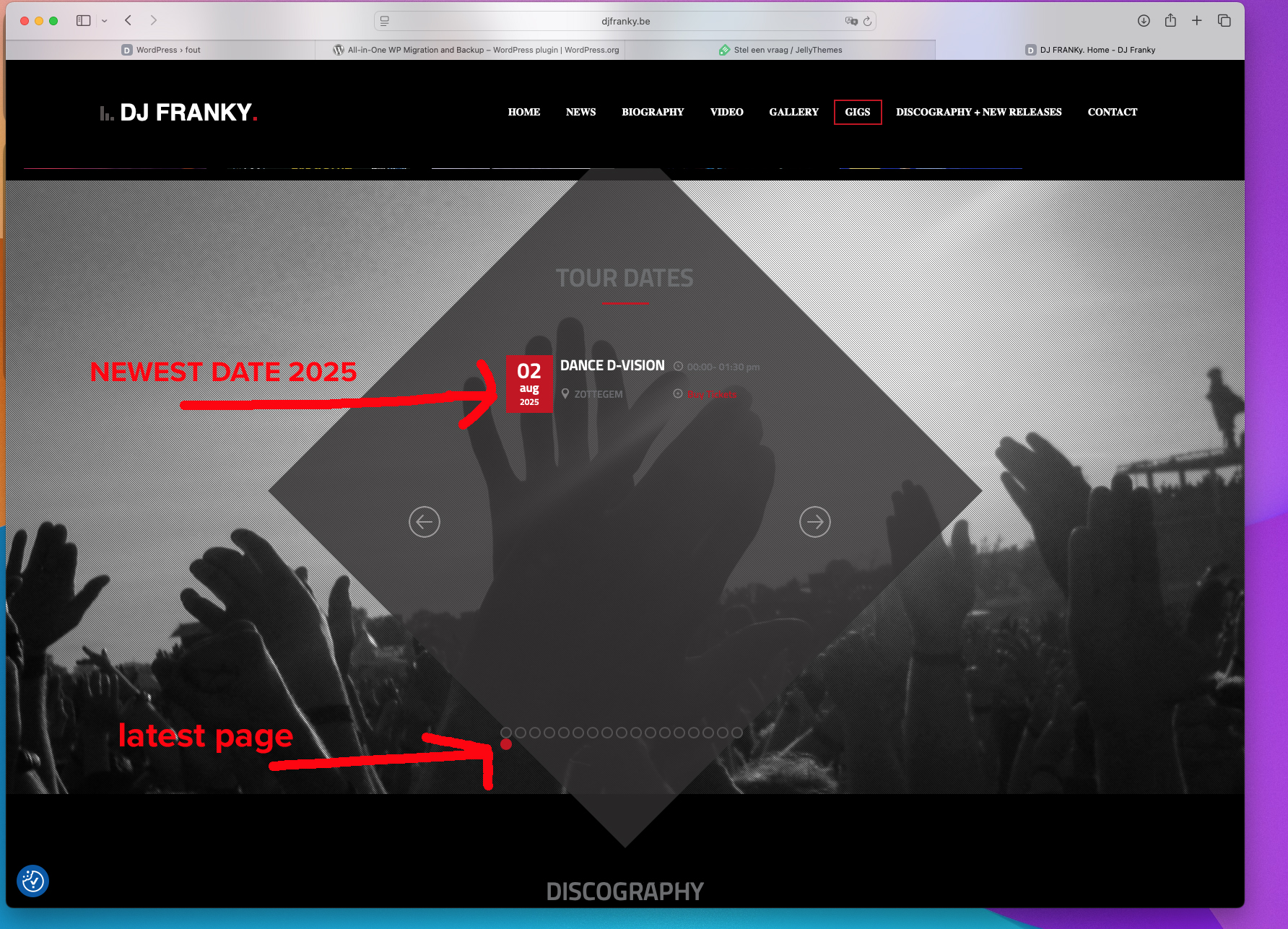 On the LAST page you see my latest GIG , from 2 august this year 2025) (see print screen) , but it's on the last page , ( see also my print screen ). maybe I have to much tourdates , gigs ? :). Thanks for help, greetings
